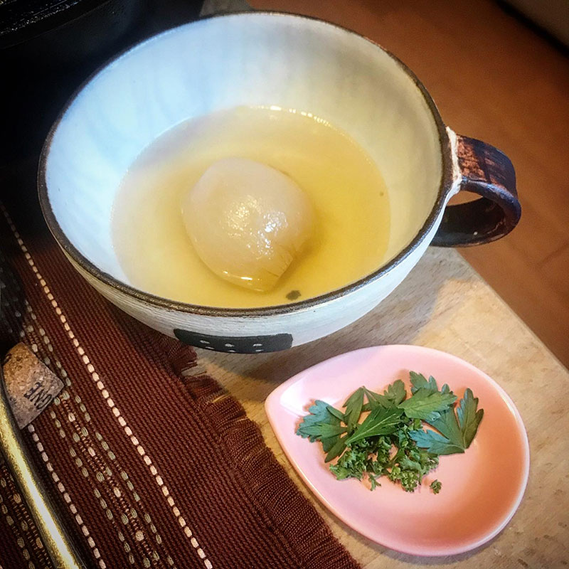 近所の方にいただいた小さな新玉ねぎの丸ごとスープ。
