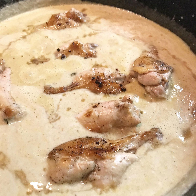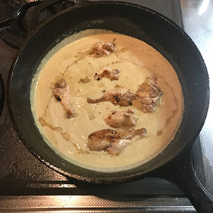 ココナッツクリームや玉ねぎのスープ、手羽元も戻しいれて