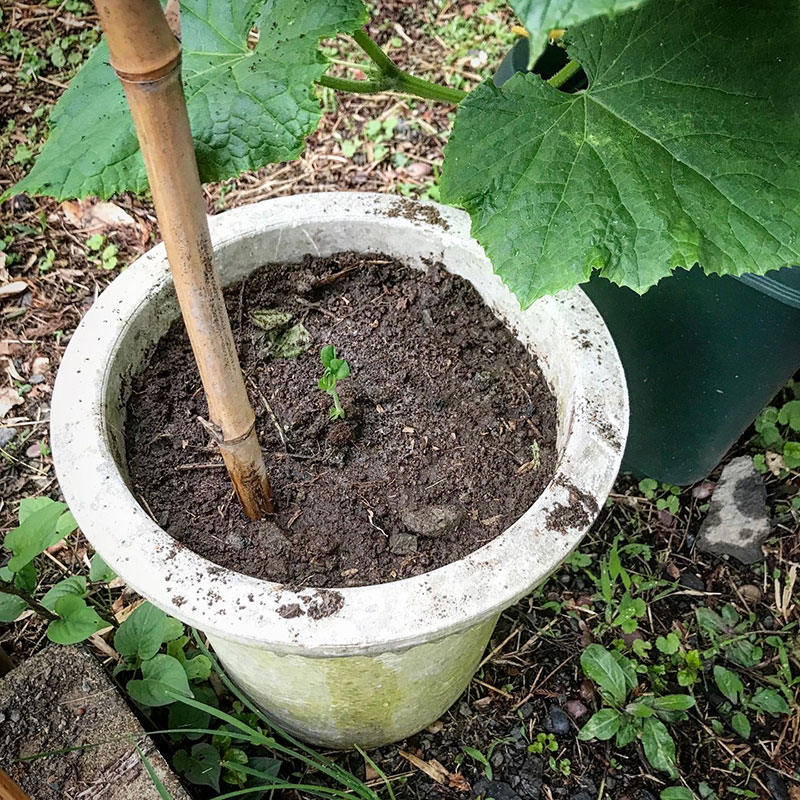 鉢がなかったのでベビーリーフを畑に移してそれに使っていた鉢を使う。