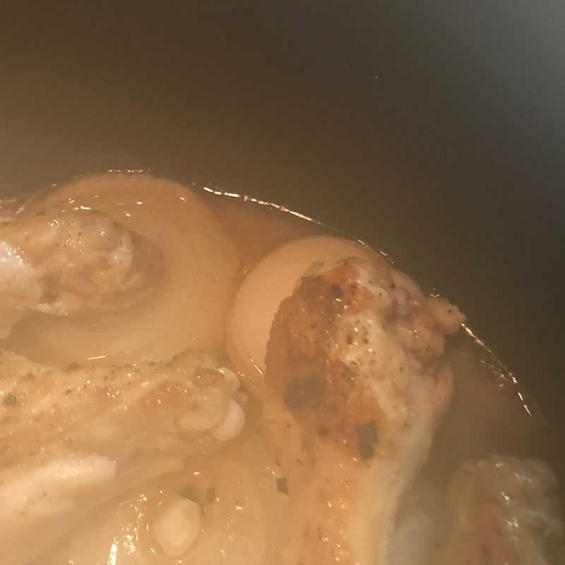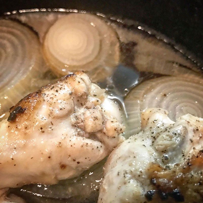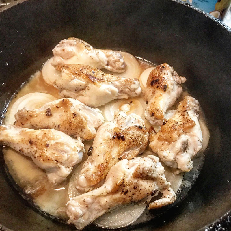 新玉ねぎひとつスライスして敷き詰めてその上に手羽元を並べてじっくり弱火で蒸し焼き。