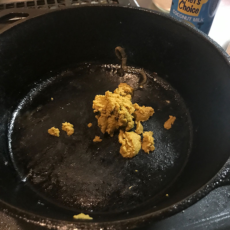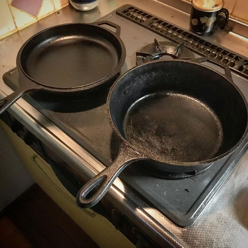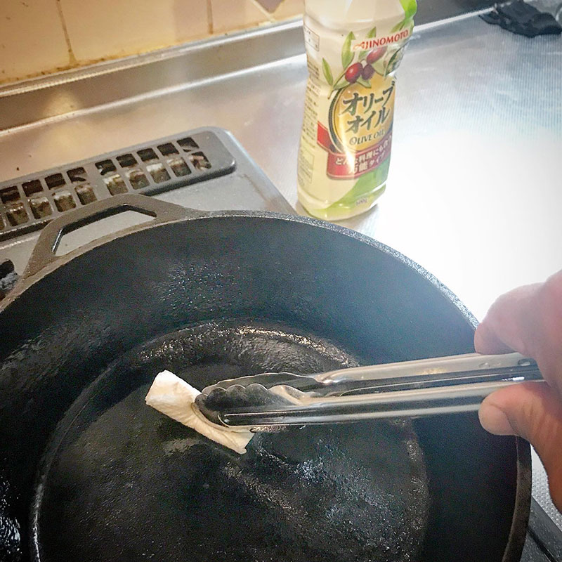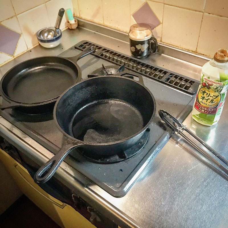 食後にカレーを別の鍋に移してスキレットのメンテナンス。空焼きしてオリーブオイルを塗る。鍋と同じ様に料理するのをダッチオーブンに変えるだけで美味しさ倍増なんだけどこのメンテナンスだけ辛い。
