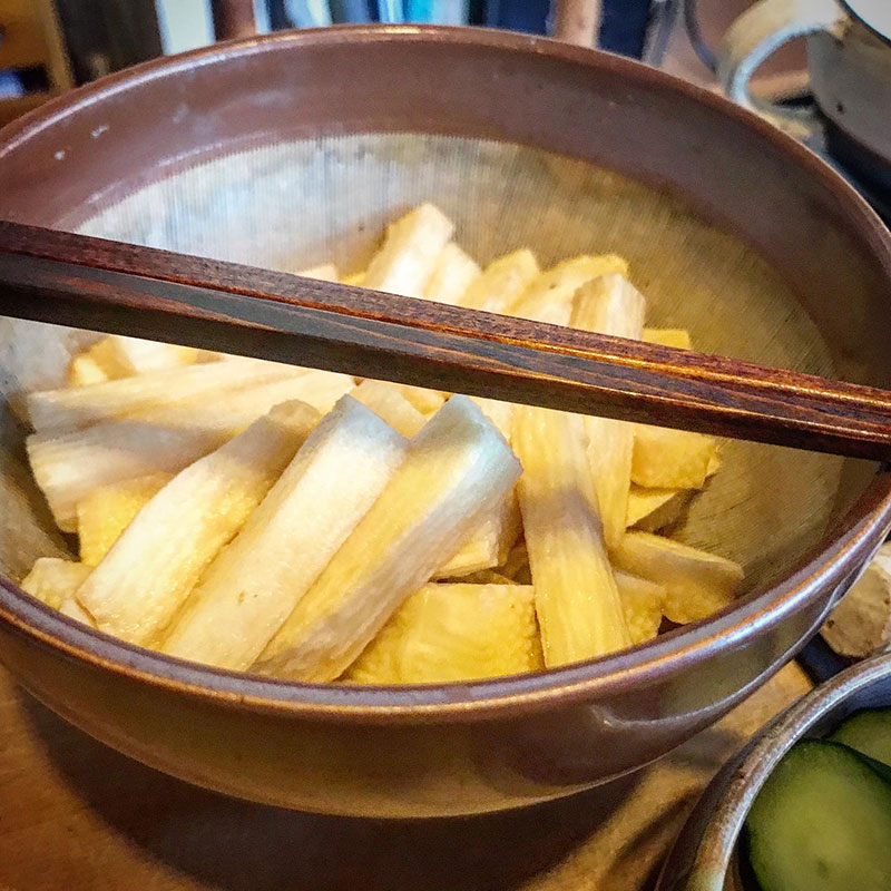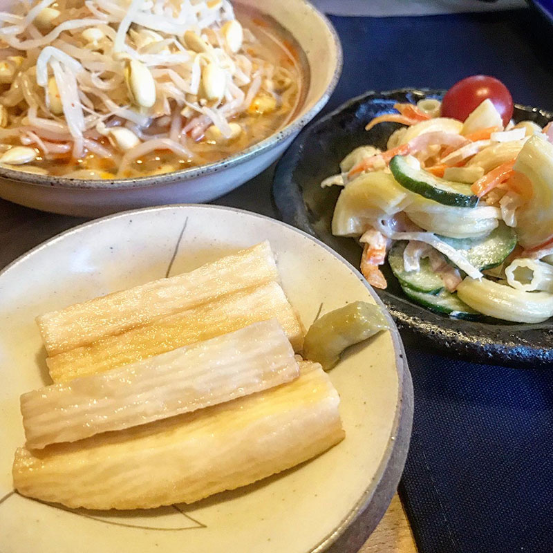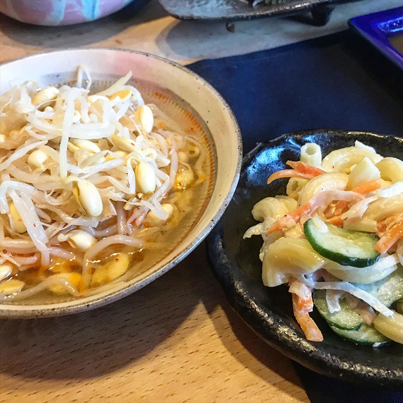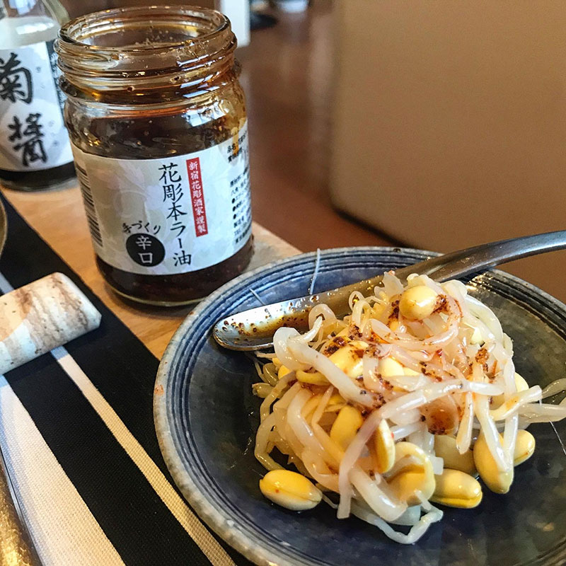 豆もやしには新宿の花彫本ラー油でピリ辛に味変。