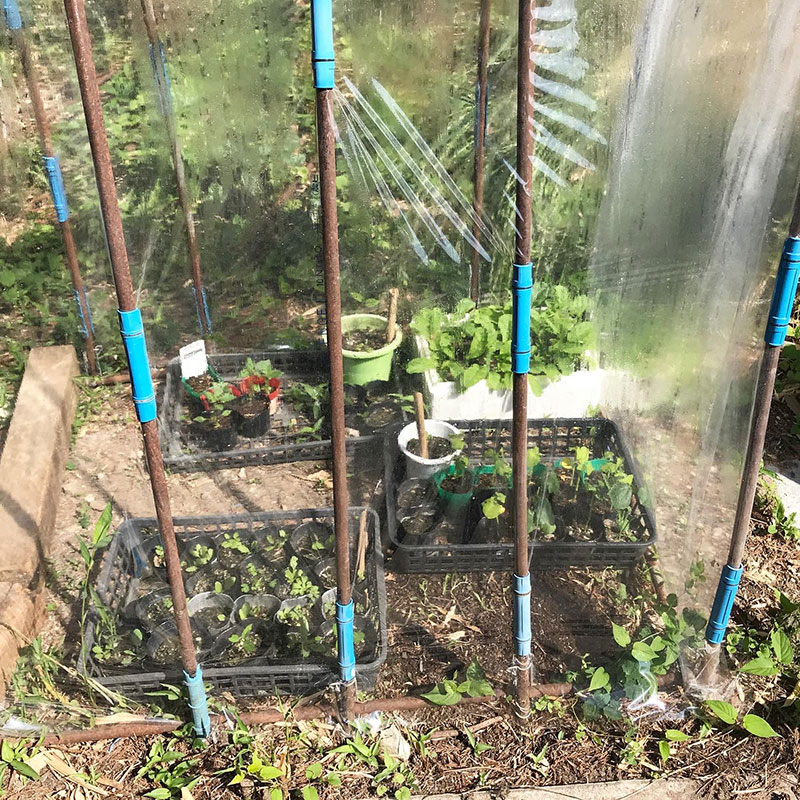 猫の額なビニールハウス。友達のお百姓さんにもらった寒さに弱い島オクラと五角オクラは、梅雨の寒さをこの手作りのミニハウスでしのいでもらって本葉が5枚になったら庭の猫の額畑に移植するつもり。移植しきれない苗は友達にもらってもらう。これだけ手をかけて植えるところないからって捨てられない。