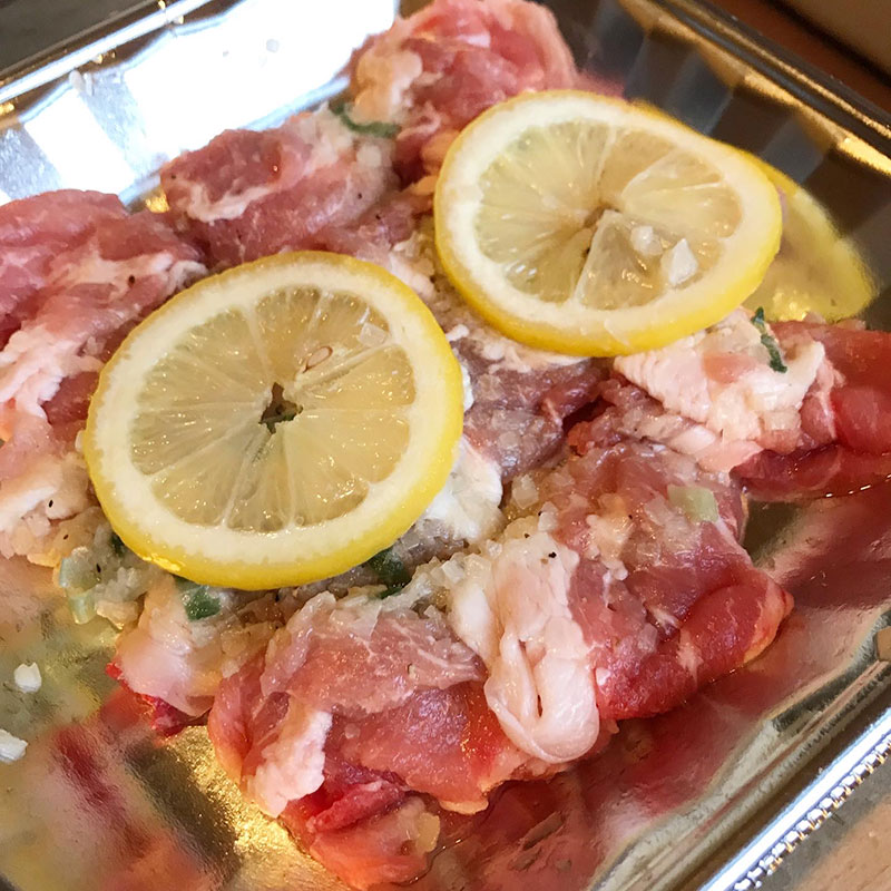 レモンで漬けた豚肉と野菜焼き。
