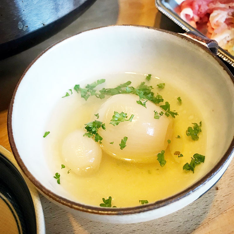 小さな新玉ねぎを丸ごと煮込んだスープ。