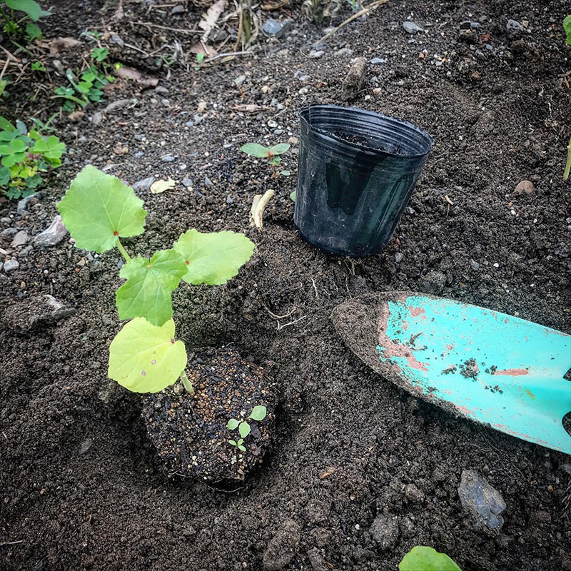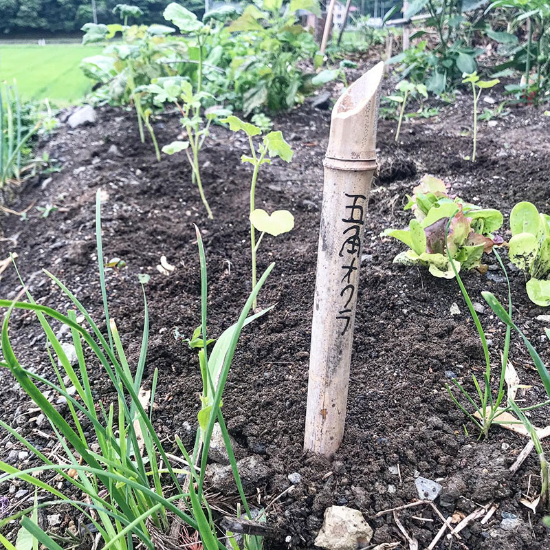 オクラの苗を畑に定植した。丸森町の自然農のみどりさんに分けていただいた沖縄島オクラと五角オクラの種をポットにまいて廃材で作った庭のミニハウスで育ててきた。