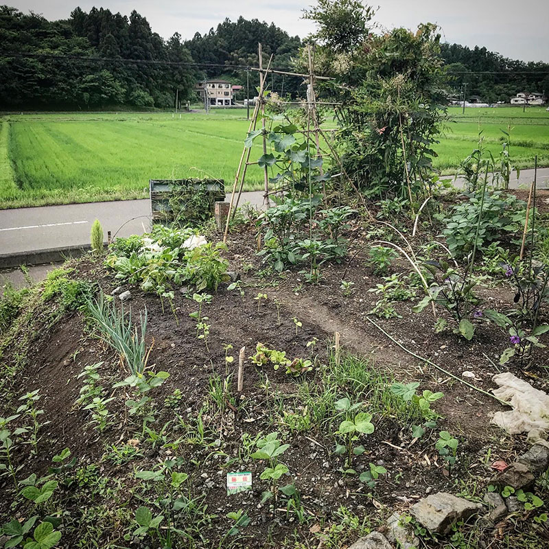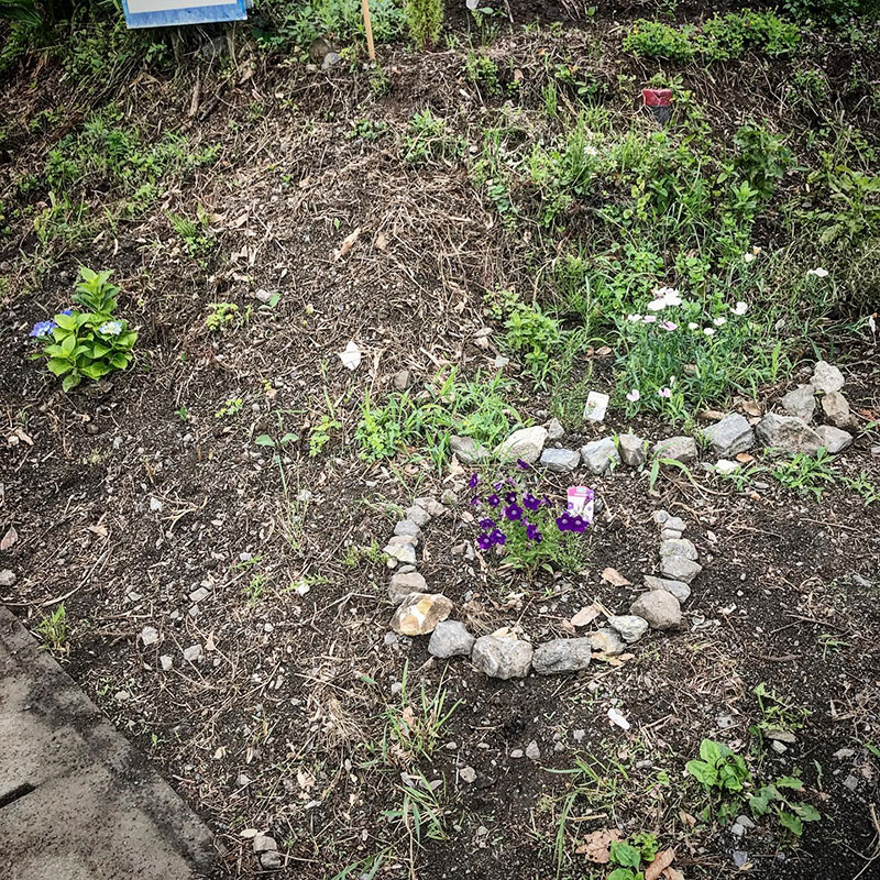 野菜を植えられない土手にはの花を。紫陽花、サフィニアポップ、なでしこ、ひまわり。あちこちの道端に咲いていた名前のわからないピンクの小さな花を咲かせる植物も一ヶ所に集めて。去年定植したヒメイワダレソウも根付いて少しずつ増えてる。