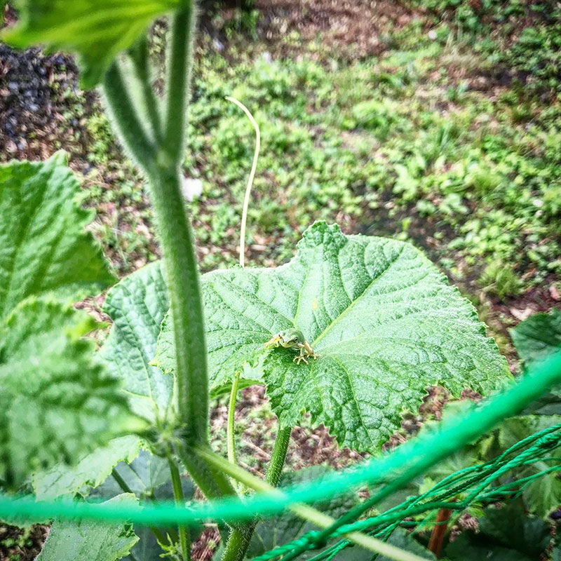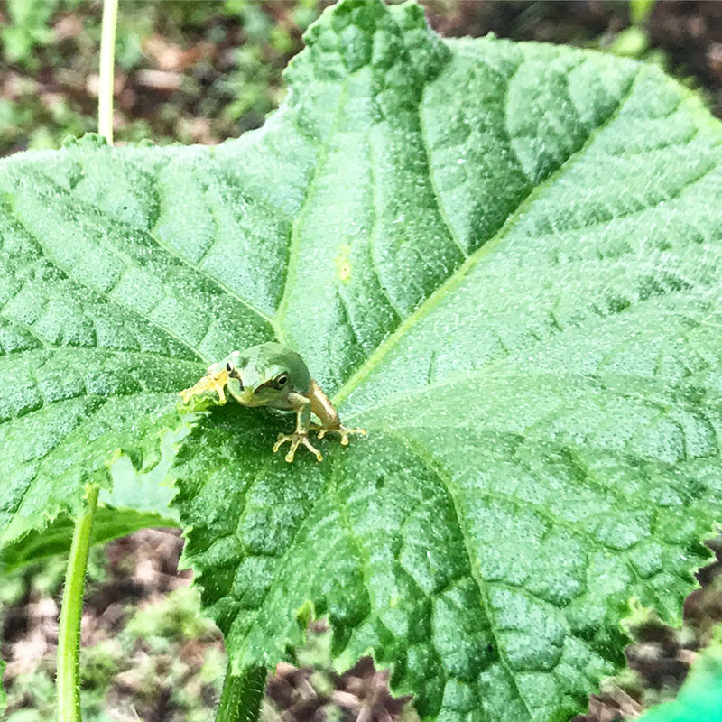 緑のカーテンのきゅうりの葉に乗るアマガエル。