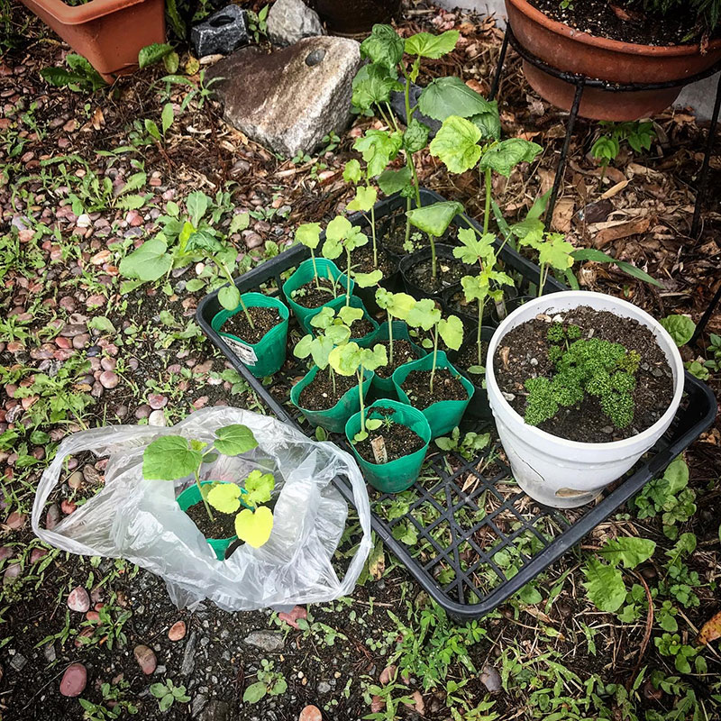 友だちの自然農をやってるみどりさんに分けていただいてポットに種をまいてミニハウスで育てていた五角オクラと島オクラ。友だちに一株ずつお裾分け。
