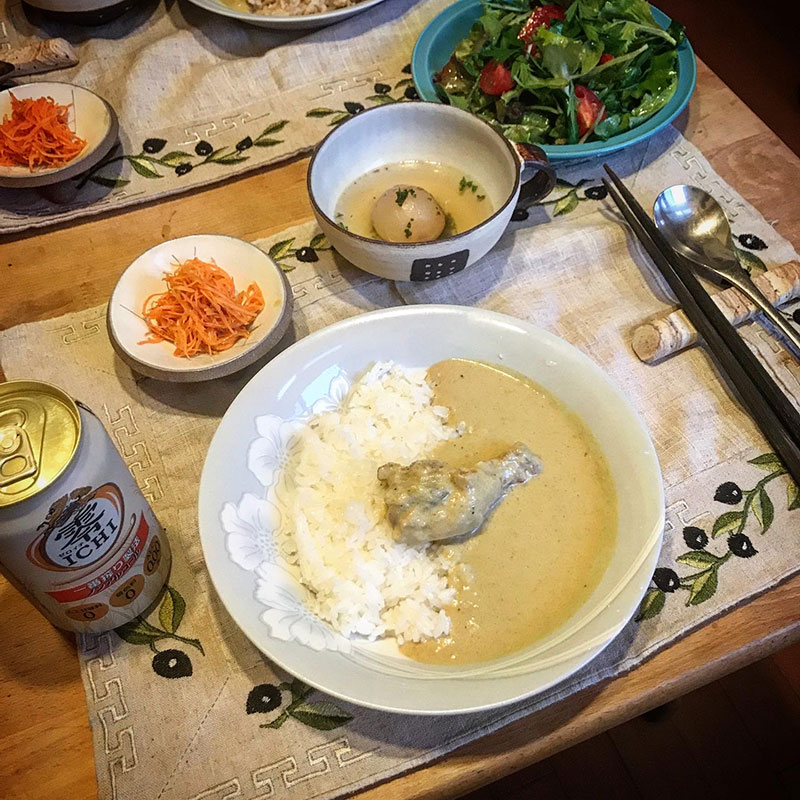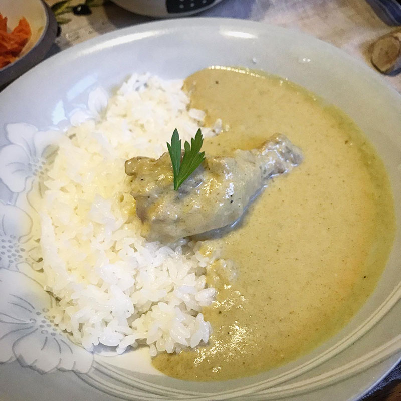 幼なじみにもらったタイのペーストと手羽元で作ったグリーンカレー。小さな新玉ねぎの丸ごとスープ。