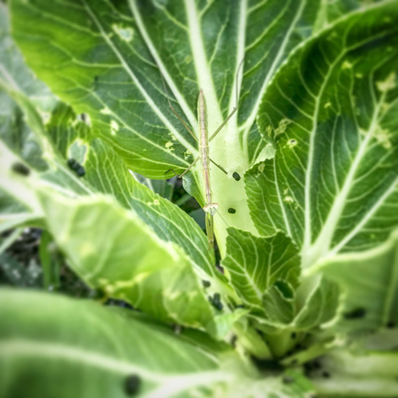 虫食い穴だらけの青梗菜の中にいた小さなカマキリ。