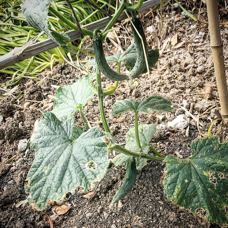全然雨が降らないのでひねくれて曲がっているきゅうり、