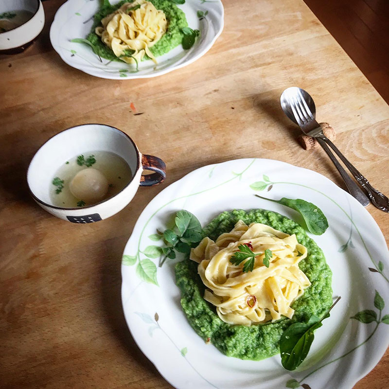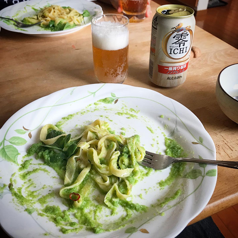 昼飯に、手打ちタリアテッレのアーリオ・オーリオ・ペペロンチーノ ブロッコリーソース添え(長い!)作った。