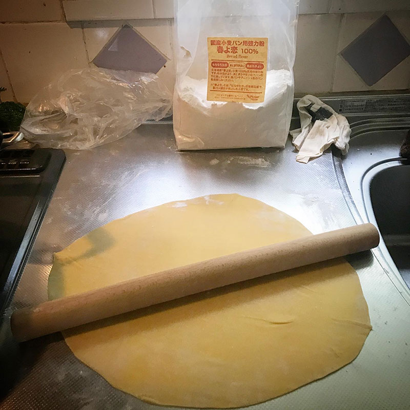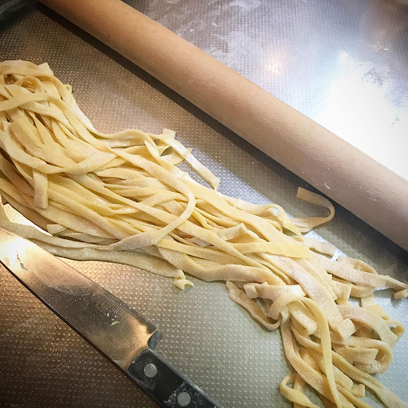 昨晩捏ねておいたタリアテッレの生地を伸ばして切って麺にしたら茹でる。