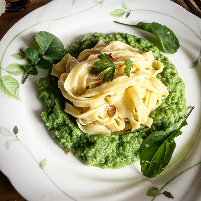 ニンニクオイルに鷹の爪に茹で汁合わせて乳化させたソースにパスタを合わせてブロッコリーソースの上に盛り付けて出来上がり。皿に添えたルッコラもとても合う。