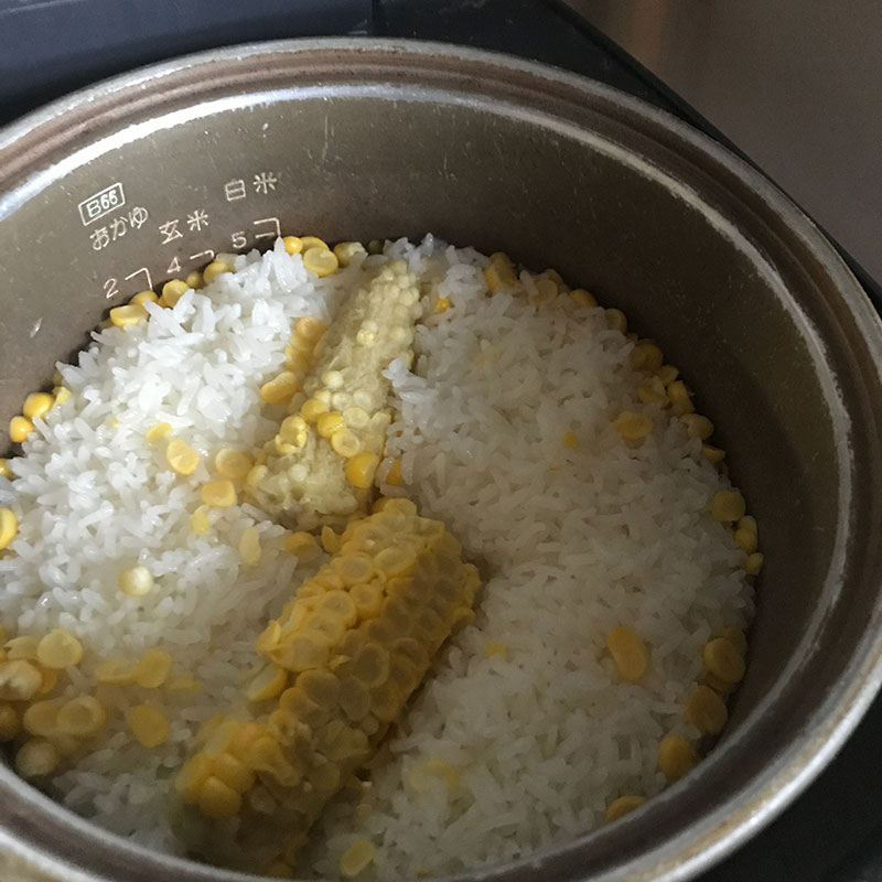 試し取りしてみた畑のとうもろこしが歯抜けで実がほとんどついてなかったので急遽とうもろこしご飯に。黄色い粒がほとんど見えませんが(笑)芯も一緒に炊いたので甘くて美味しい。