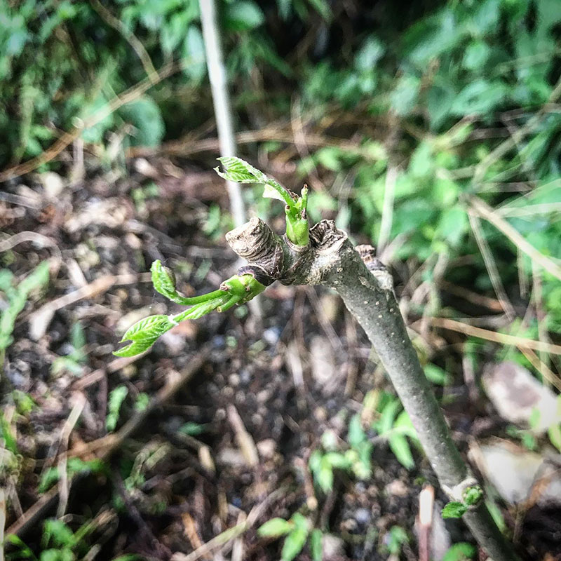 再移植したコシアブラの木が新しい葉を出そうとしてる。