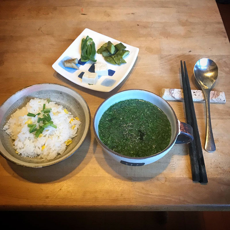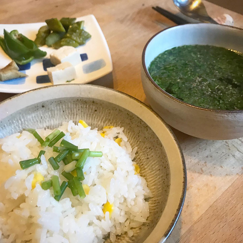 とうもろこしご飯とモロヘイヤのスープとぬか漬けのひとり飯。これだけですけど何かw?