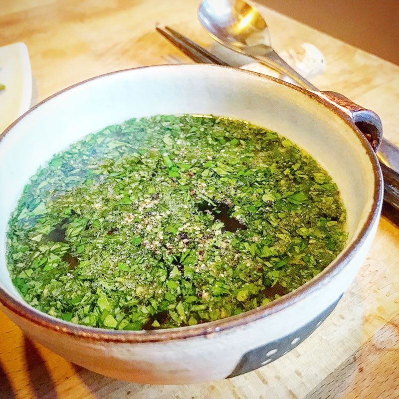 チキンスープと混ぜただけのモロヘイヤのスープ。このエジプトのスープはクレオパトラも飲んだとか飲まないとか。
