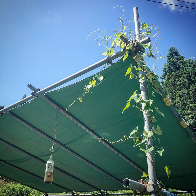 雨よけテントの足場パイプの蔓草がてっぺんまで到達。
