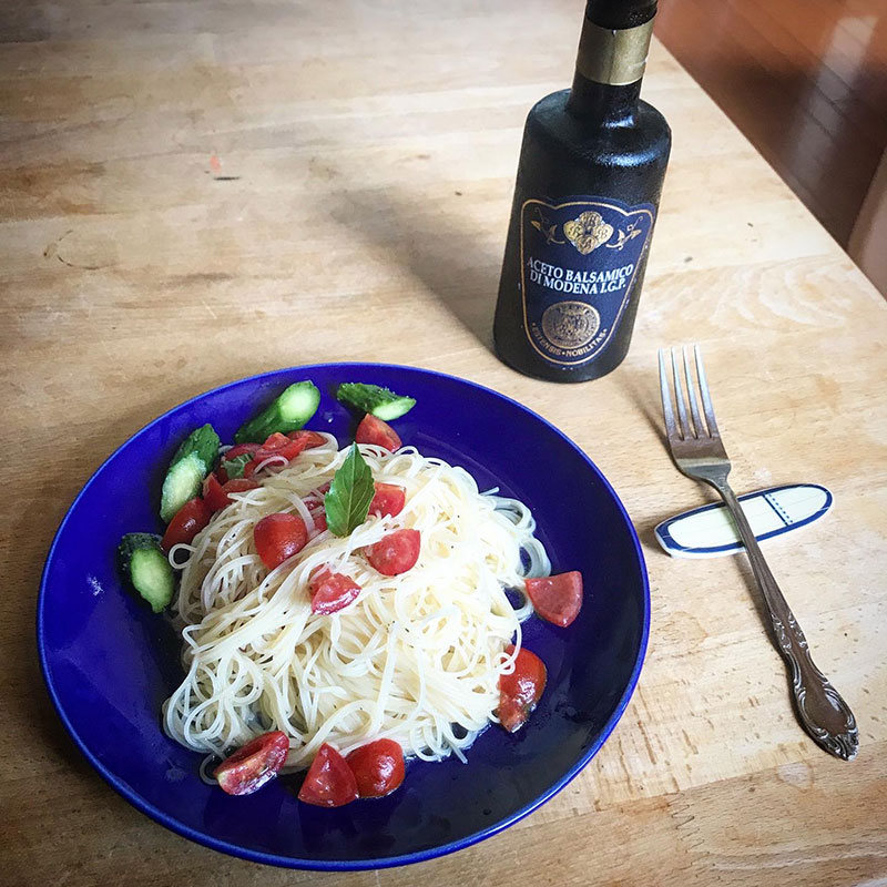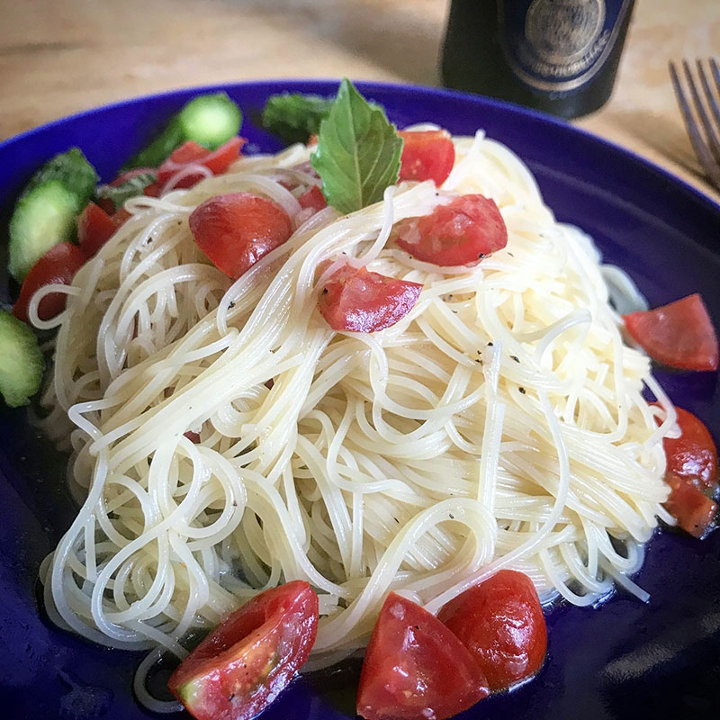 汗だくで昼飯に戻ってカッペリーニを2分茹でて氷で〆たら冷やしておいたトマトにレモン汁やバルサミコ酢も合わせて畑からレモンバジル摘んできてミニトマトとカッペリーニの冷製パスタの出来上がり。料理とも言えないくらい簡単なので毎年夏に何度か作る。
