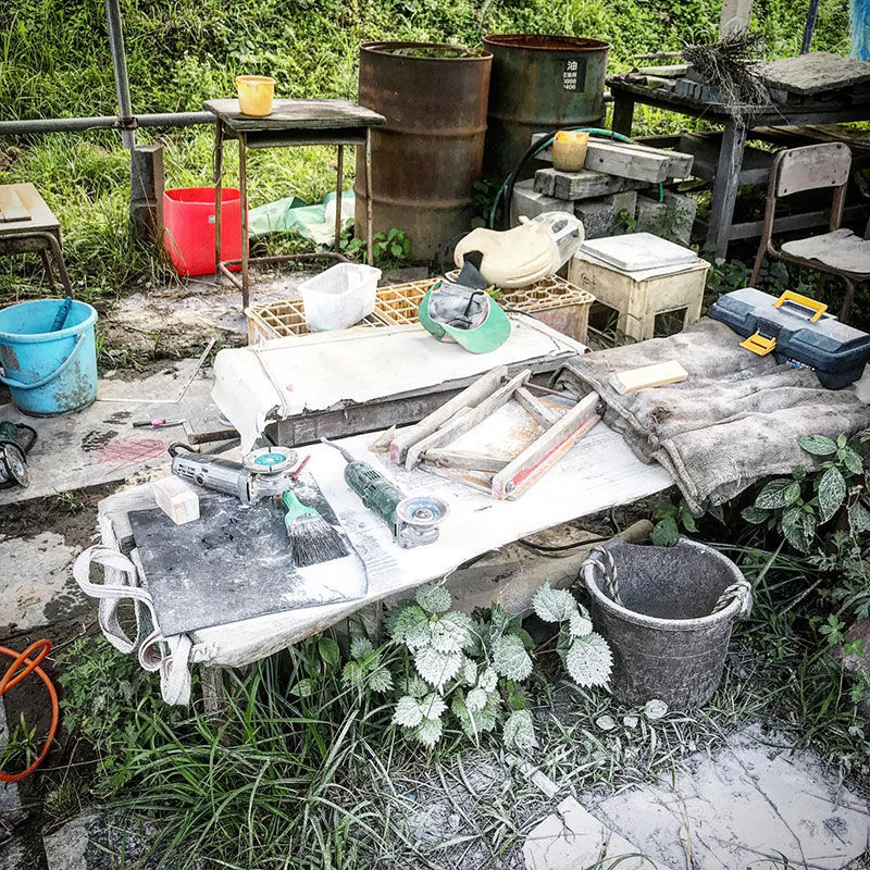 さて、マスクして耳栓してメガネかけて石彫りの続きしよう。