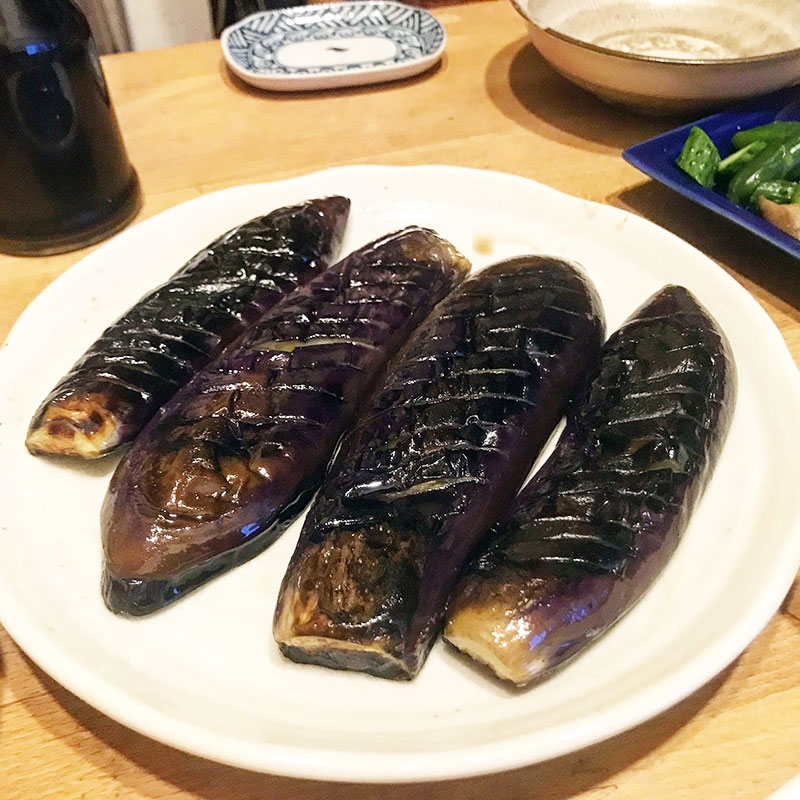 いただいたすぐに仙台長茄子は味噌汁に、ナスは焼きナスに。いつもは薄くスライスしてたっぷりの油を吸わせて再び吐くまで火を入れてトロトロに焼くのだけど今日は茄子をくれた方が教えてくれた通りに焼いてみた。その方法はふたつ割りにして皮目に斜めに筋切りしたら全面に塩もみ。焼く前に塩を洗い流して水気を絞って焼く、というもの。油が少なくて済むし皮目がきれいな色で焼けるって。