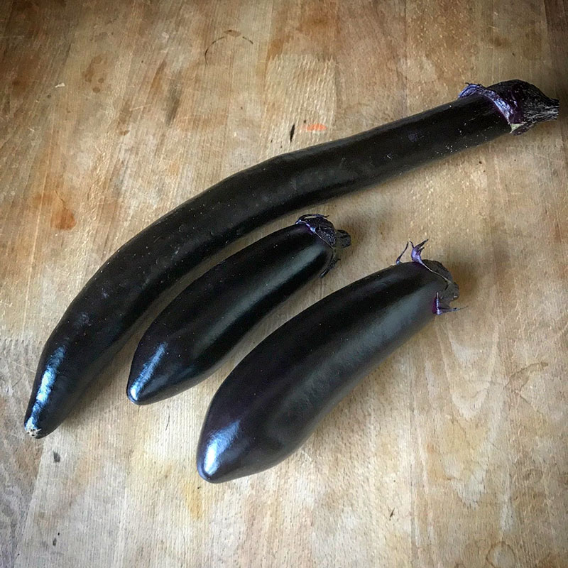 近所の方に採りたての茄子をいただいた。スーパーでもなかなか見られない充実してきれいな存在感のある茄子2本と仙台長茄子。