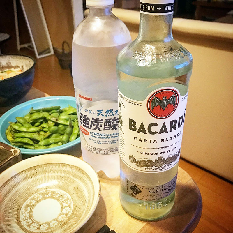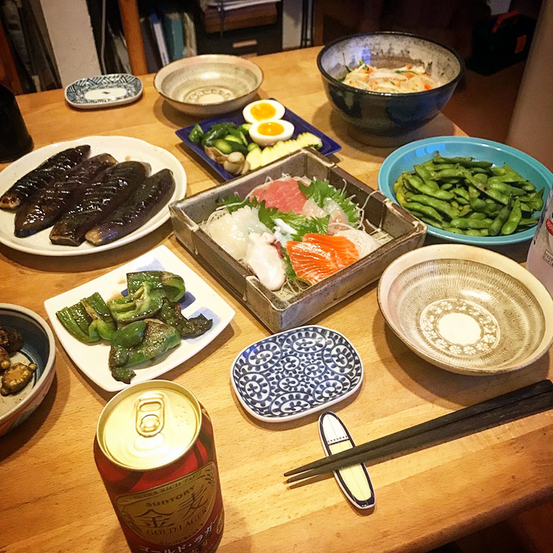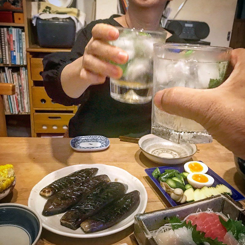 カミさんと乾杯。夕方、近所の方にいただいた立派な茄子を教えられた通りの方法で焼いてみた。