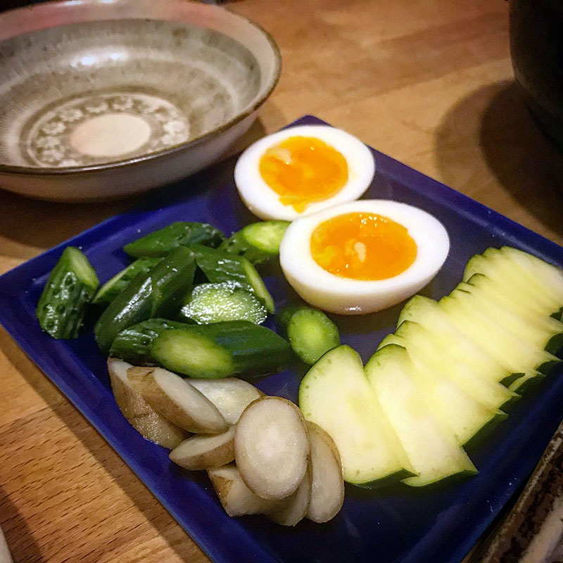 今宵のぬか漬けはごぼう、ズッキーニ、半熟ゆで卵、畑のきゅうり。