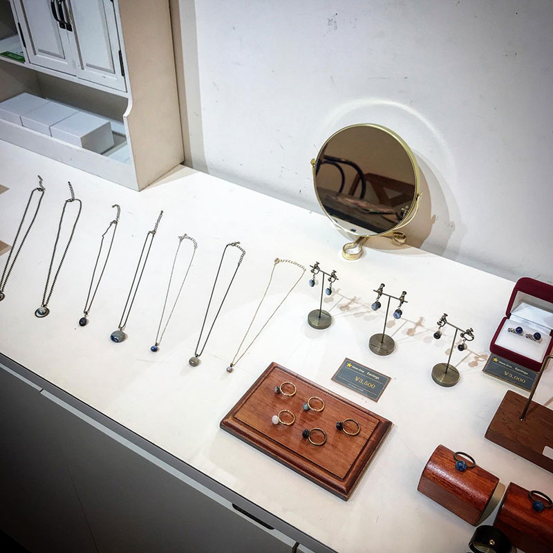 釉薬の溜まった水滴の様な形で奥様の作ったアクセサリーも素敵。