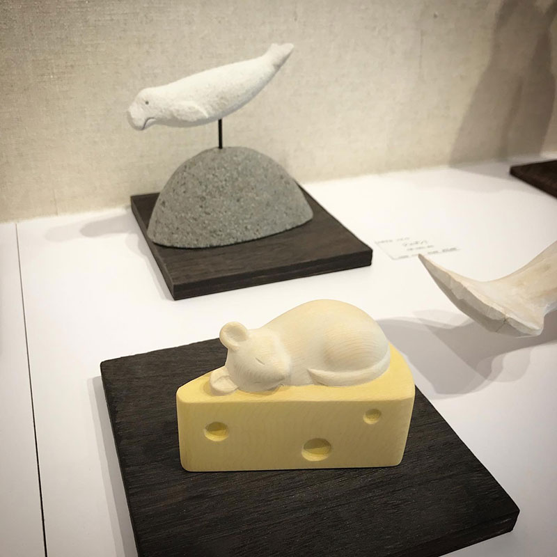 これもスギサキマサノリくんの石のマナティー、チーズに乗ったネズミの木彫。