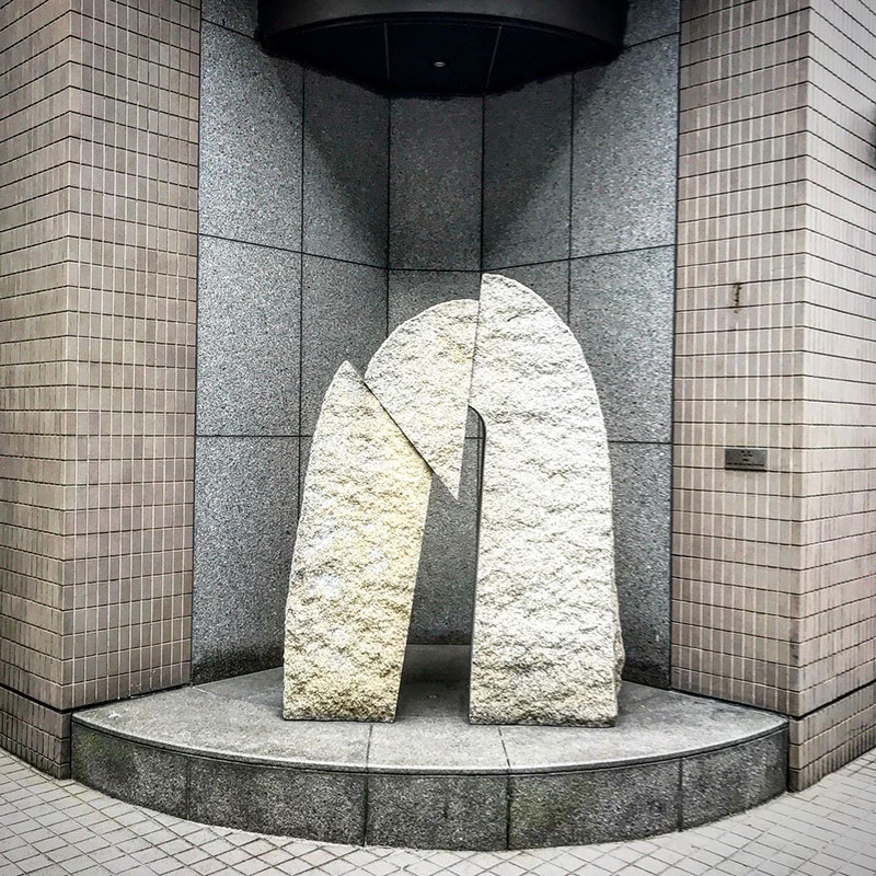 そしてそのすぐ近くのビルの角にはスギサキマサノリくんの石彫「神話」素晴らしい。