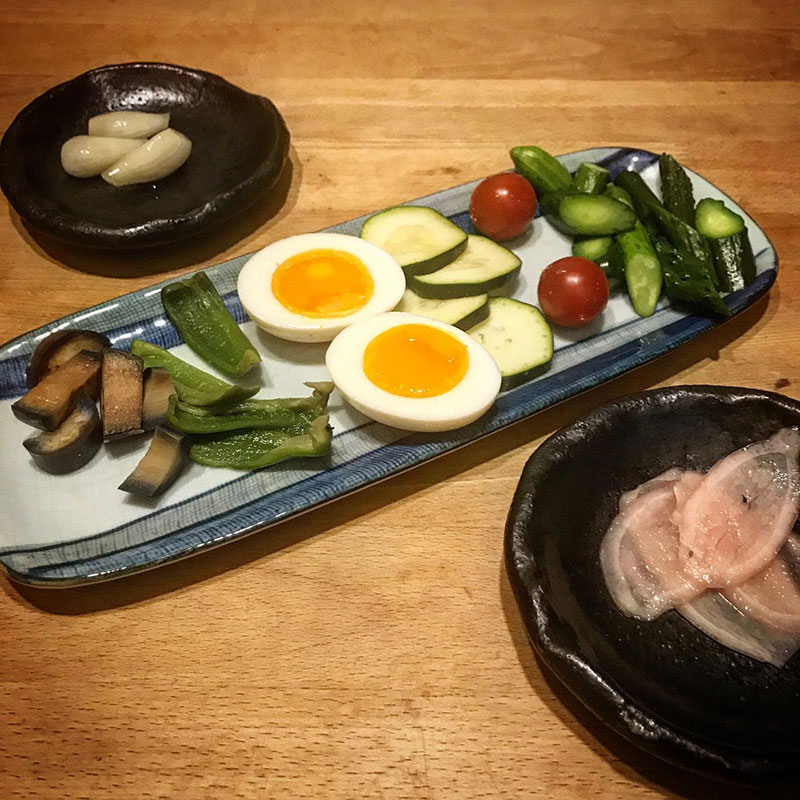 今宵のぬか漬けは冷蔵庫から出して水から茹でて沸騰したらきっちり4分半で急冷するいつもの超半熟卵、ナス、ミニトマト、ズッキーニ、ピーマン、きゅうり。んー食いしん坊で卵とズッキーニ待ちきれなかった。2日我慢するべきだった。明日に期待。超半熟卵は3日でもいいかも。良く漬かったミニトマトのちょっとシュワっとする感じが美味しい。