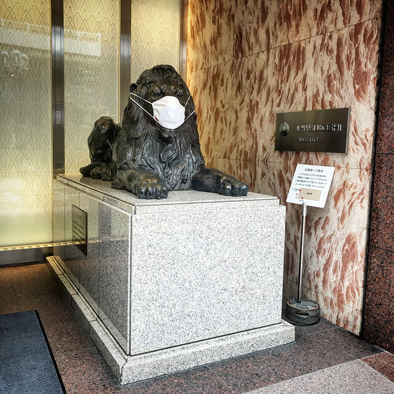 三越のライオンもコロナ対策でマスクしてる。