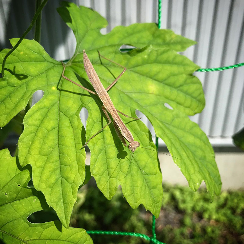 ゴーヤの葉の上のカマキリ。