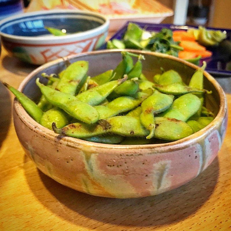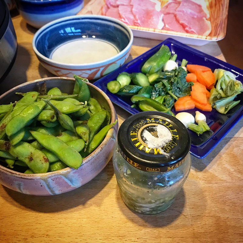 みどりさんにもらった早生の枝豆、太豊緑の甘い事!ぬか漬けを入れた紫の器は大学時代にろくろをひいて作ったもの。