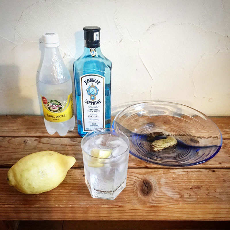 レモンが見つかったらと冷やしておいたトニックウォーターでジントニック作った。ありがとう、あやこさん!