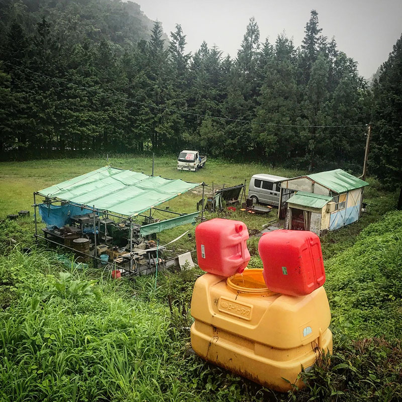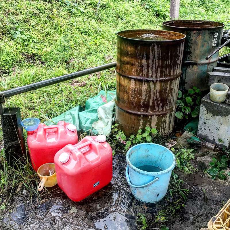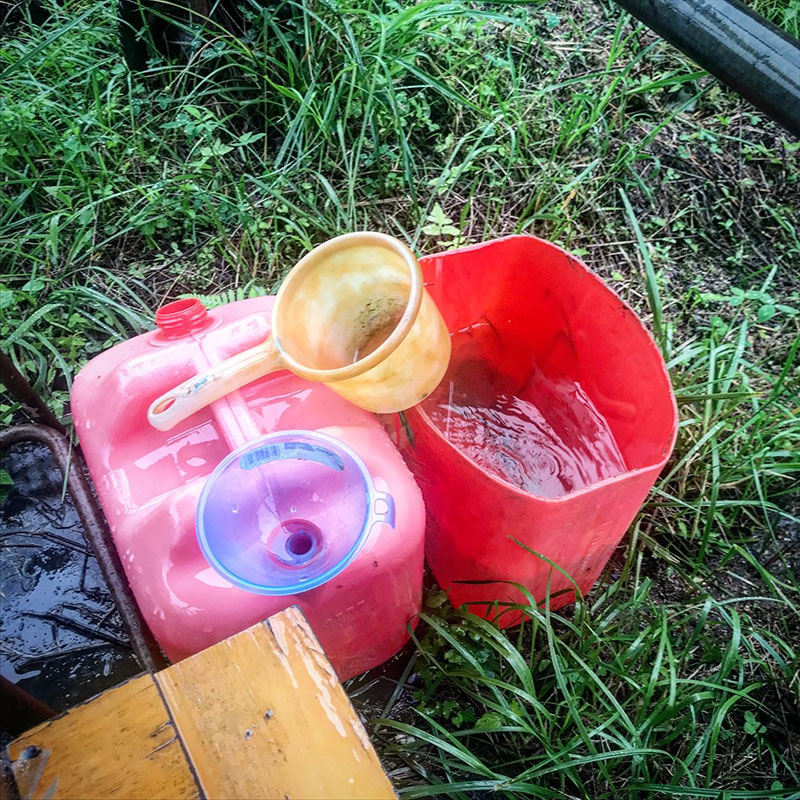 テントの下にポリ缶置いておいたら連日の大雨ですぐ溜まる。200Lのタンクも満タンに。