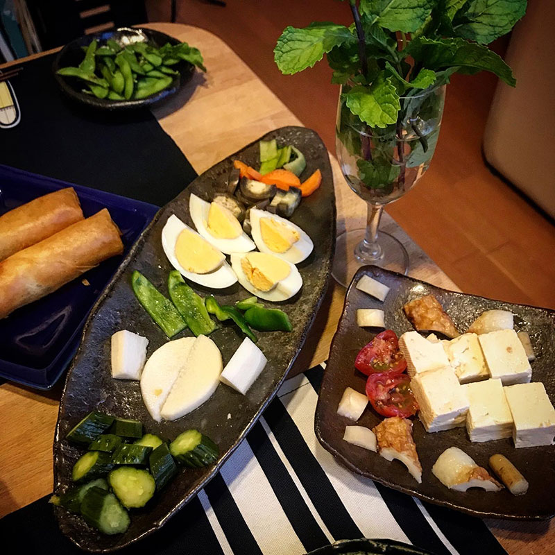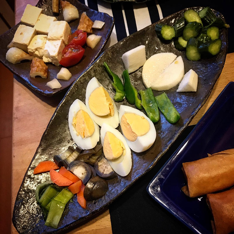それと一昨日、今宵のために仕込んだバラエティ豊かなぬか漬け。そのラインナップは、きゅうり、ニンジン、茄子、青梗菜、ピーマン、山芋、ゆで卵、ちくわ、ごぼう、豆腐、ミニトマト。