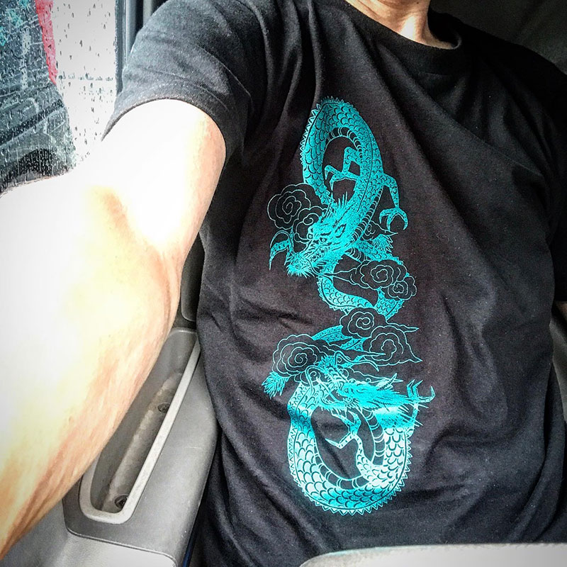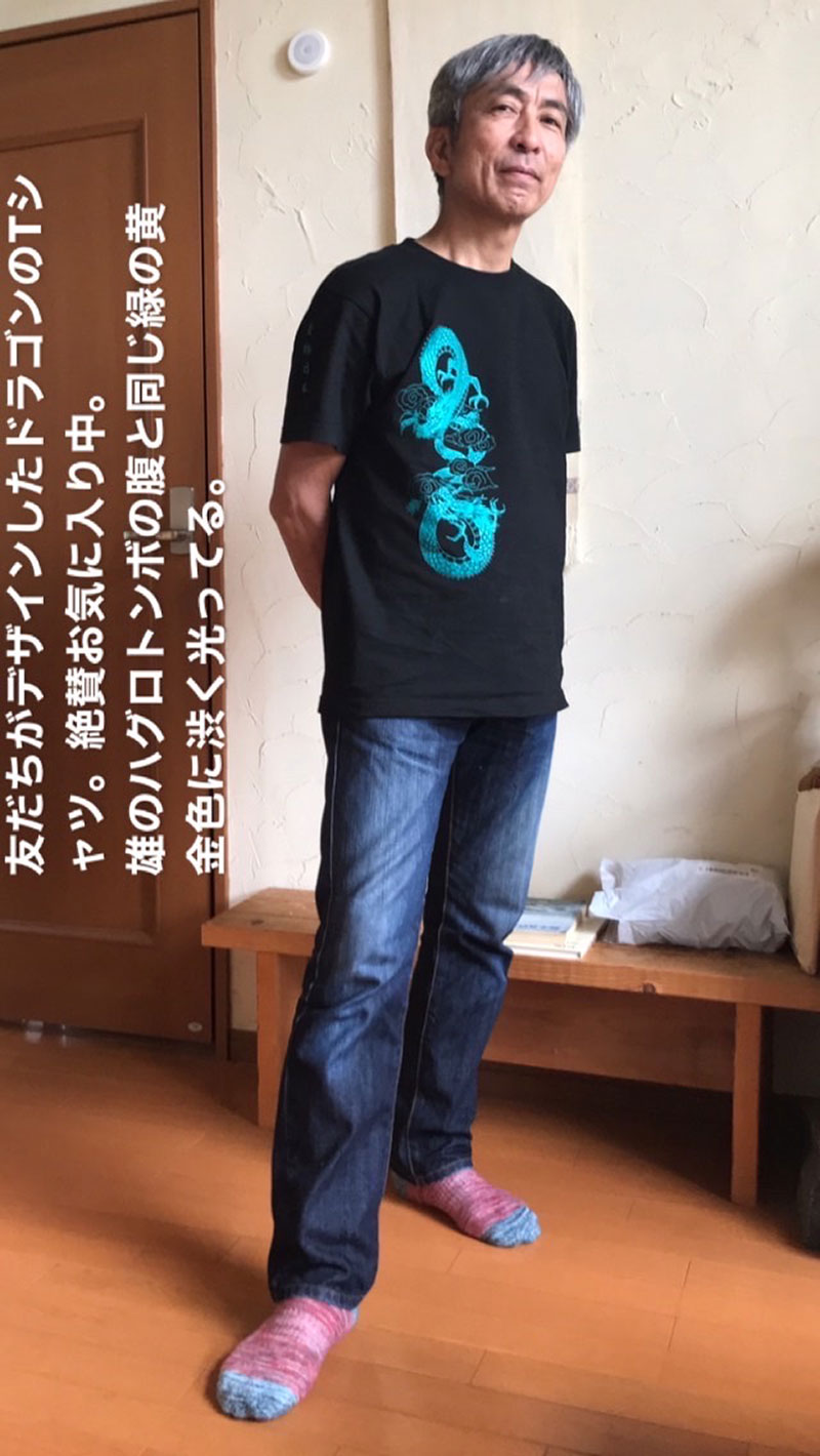 届いたばかりの、友だちがデザインしたTシャツを着て