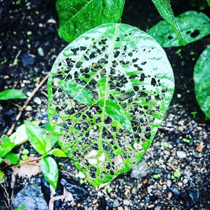 葉脈を残してほとんど虫に食われてしまった枝豆の葉がきれい。