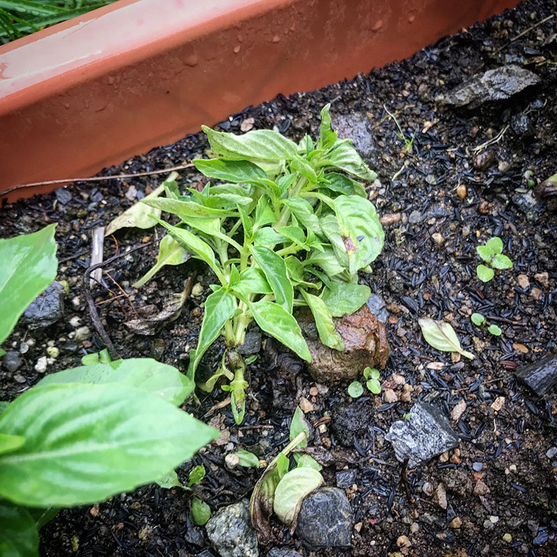 プランターのブッシュバジル何者かにまた倒された。