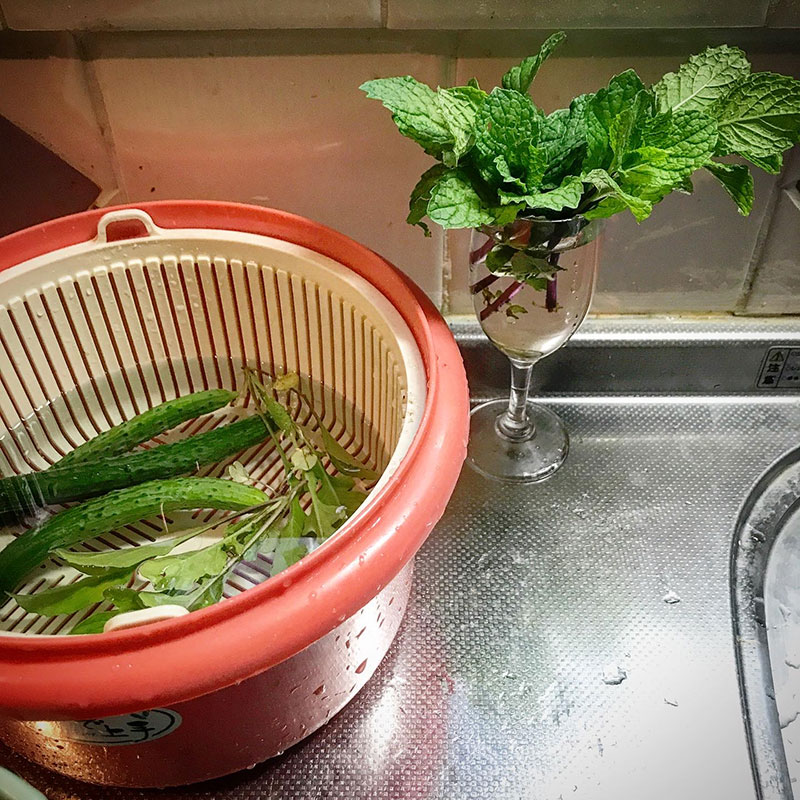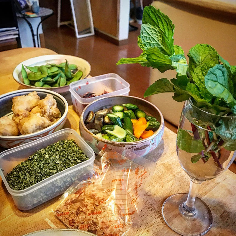 今宵のカクテル様にミントの葉をたくさん摘んでグラスに挿しておく。