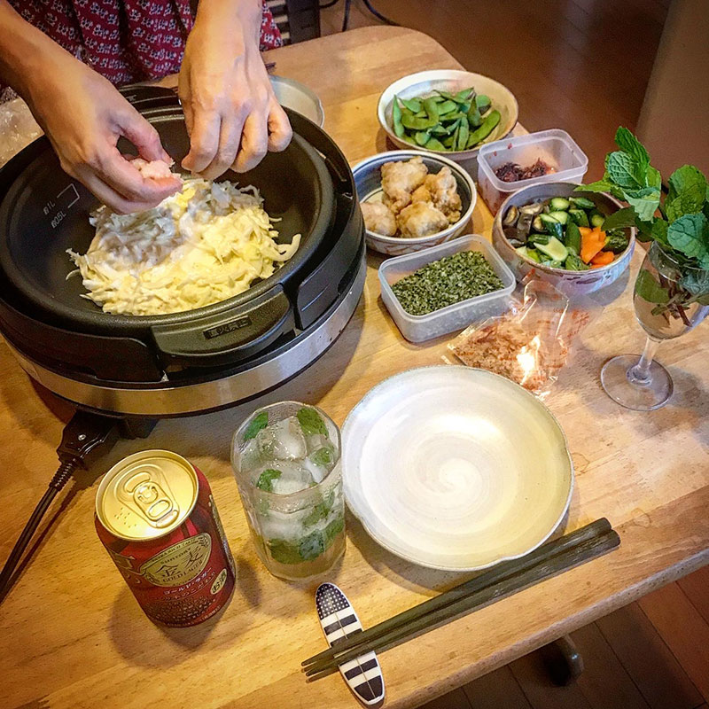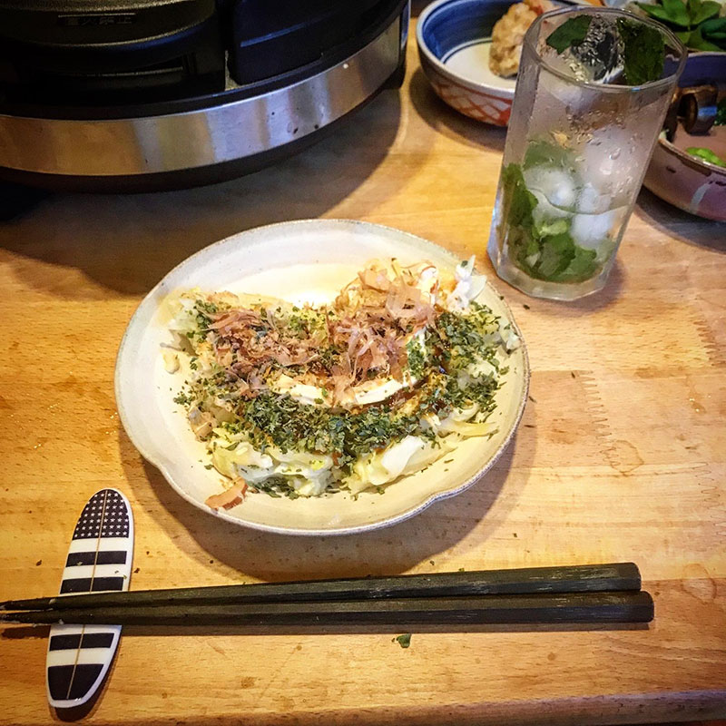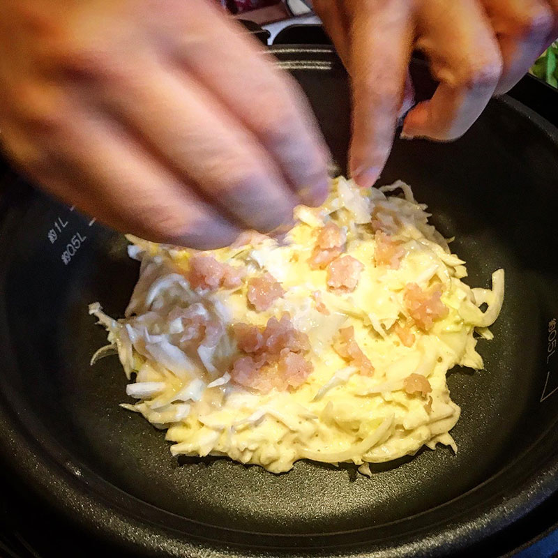 ホットプレートで府中焼き。広島の挽肉を使うお好み焼き。