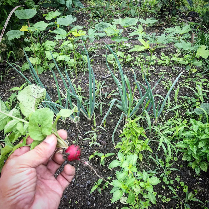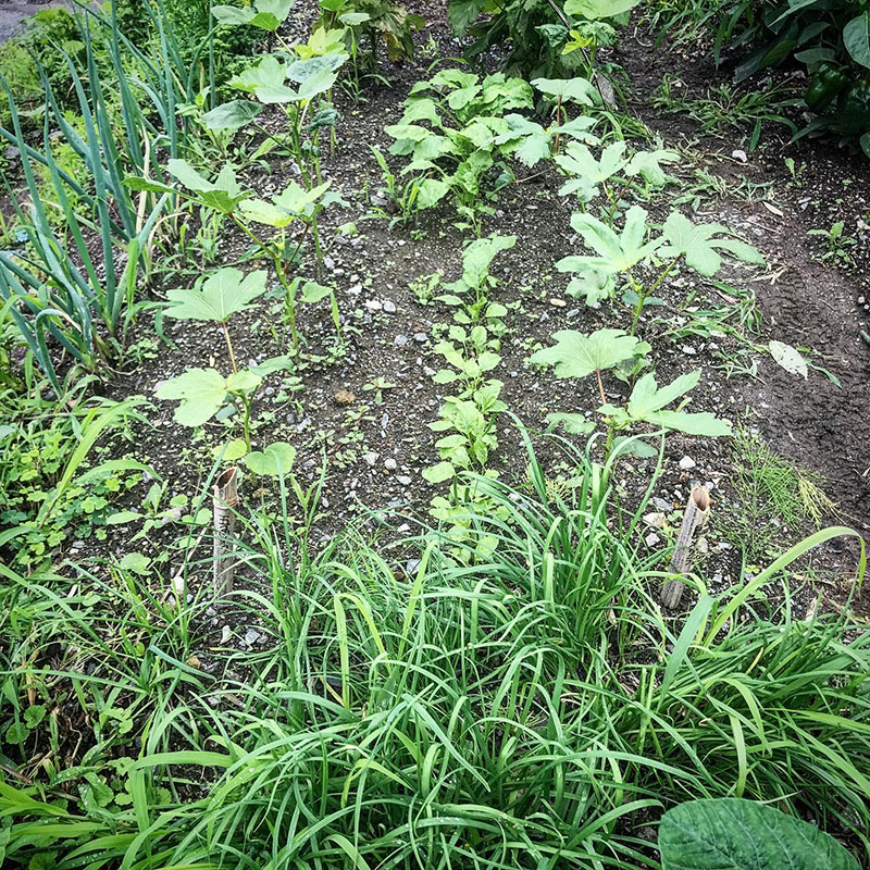 中央がカブ。その両脇がオクラ。まだこの大きさ。左右で品種が違う。手前にニラ。夏の間刈っては生えてきて5回くらい食べられる。左端の長ネギが全然大きくならない。