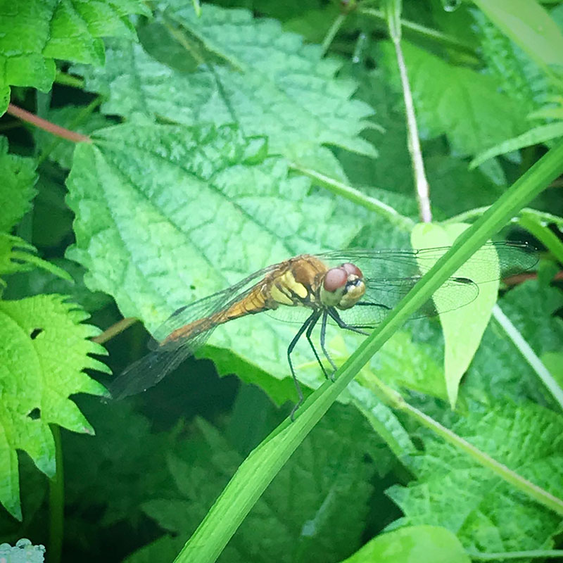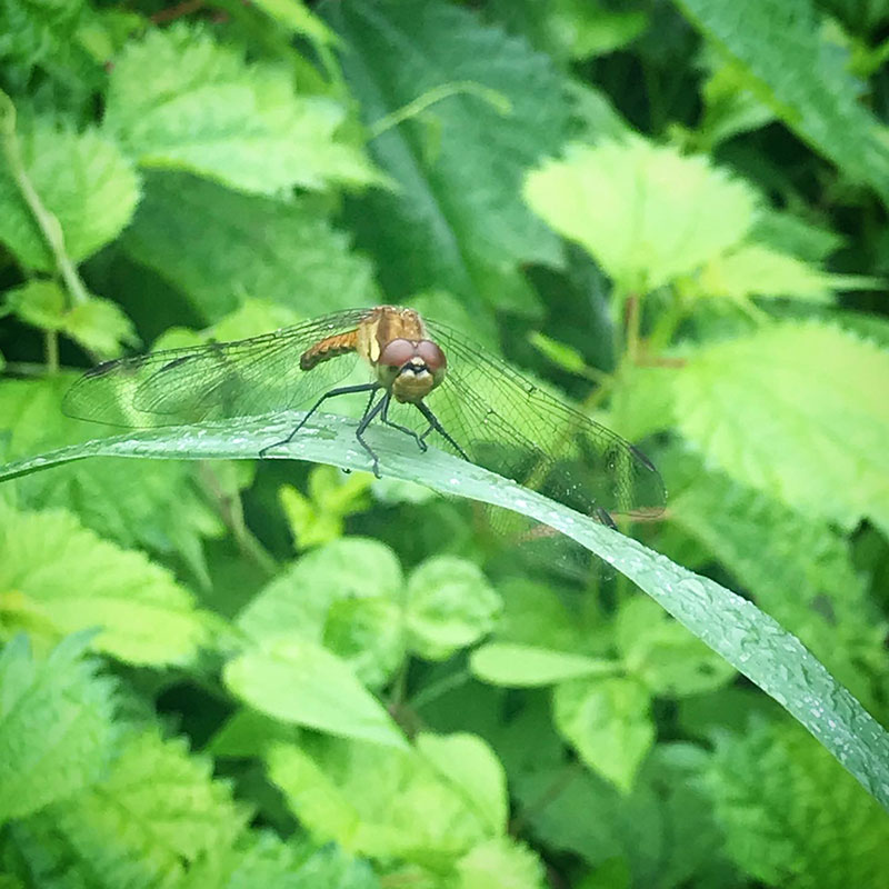 雨が霧雨になったらトンボが葉の上に出てきた。