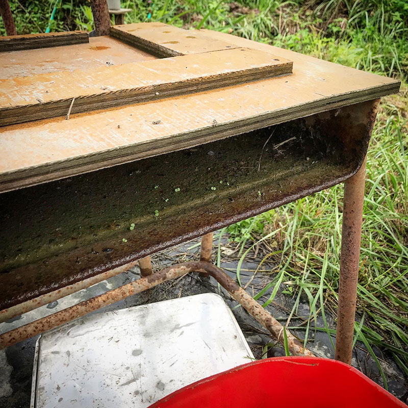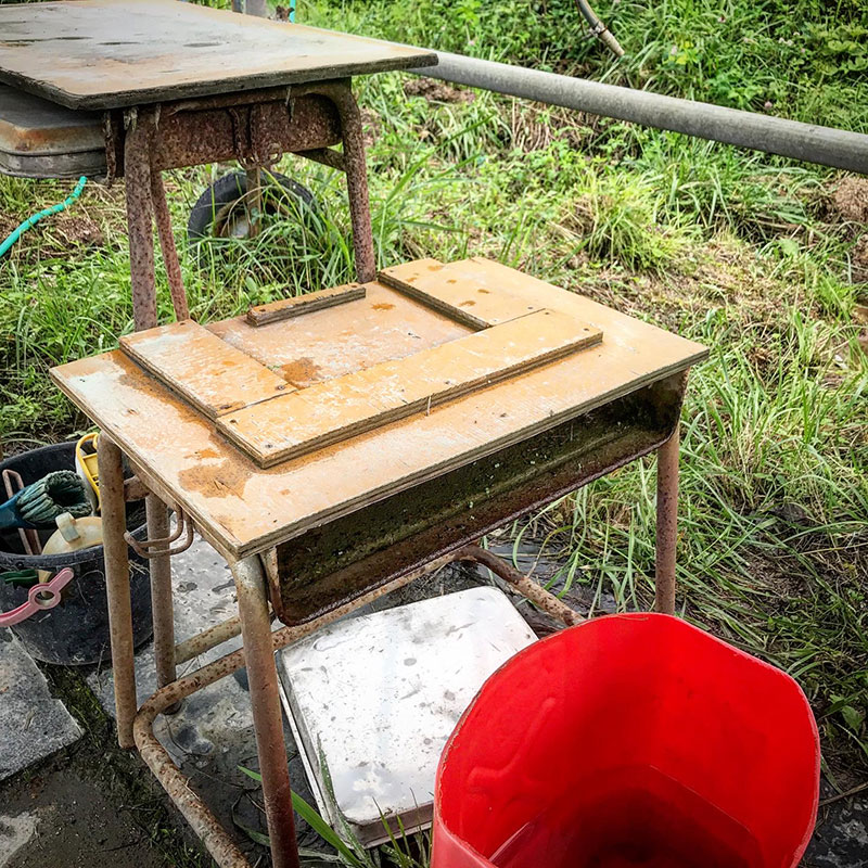 小学校の机を再利用して作った作業台。