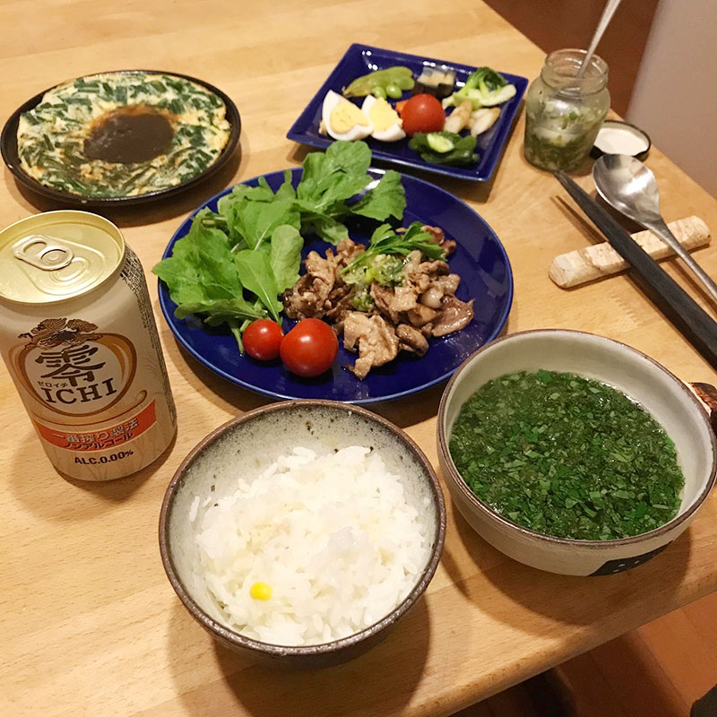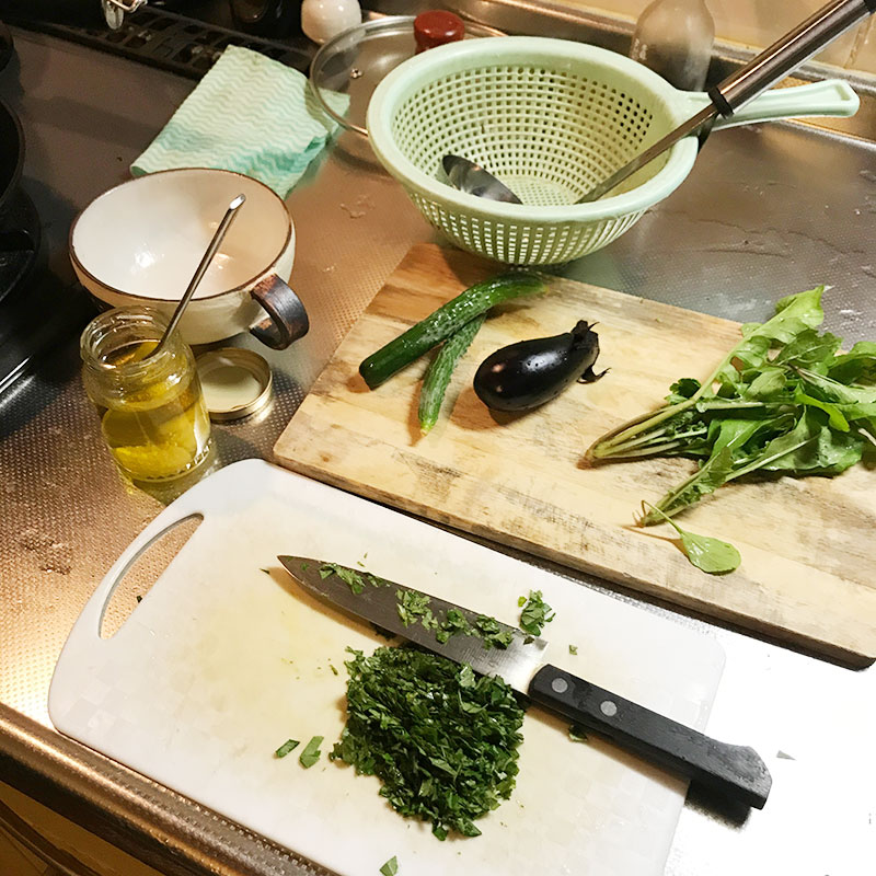 今宵のひとり飯。畑からニラやルッコラなど収穫してきて料理。