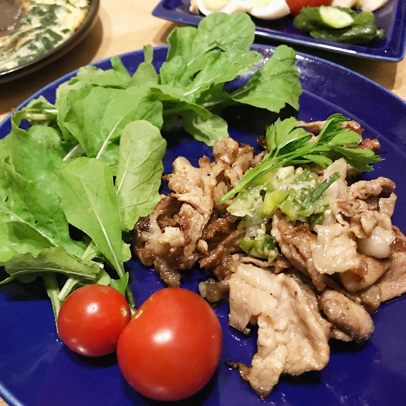 畑のルッコラやイタリアンパセリ、ミニトマト添えて。豚肉はただ焼いただけ。